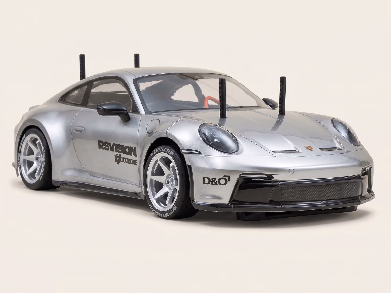 Karoserie je lexan Porsche 911, první pokus o lak a polep. Nálepky sponzorů (RSVISION, GoodCase) a pro úplnost i D&O, která zatím existuje spíš jako plán než značka.
